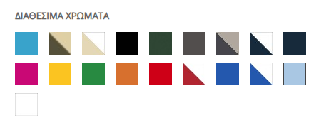 | Χρώμα | Ανοιχτό Μπλέ, Ανοιχτό Πράσινο, Άσπρο, Βυσσινί, Γκρί, Κίτρινο, Κόκκινο, Μαύρο, Πορτοκαλί, Σκούρο Γκρί, Σκούρο Μπλέ, Σκούρο Πράσινο |