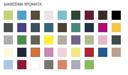 Ανοιχτό Μπλέ, Ανοιχτό Πράσινο, Άσπρο, Βυσσινί, Γαλάζιο, Γκρί, Καφέ, Κίτρινο, Κόκκινο, Μαύρο, Μώβ, Πορτοκαλί, Ροζ, Σκούρο Γκρί, Σκούρο Μπλέ, Σκούρο Πράσινο, Σκούρο Ροζ